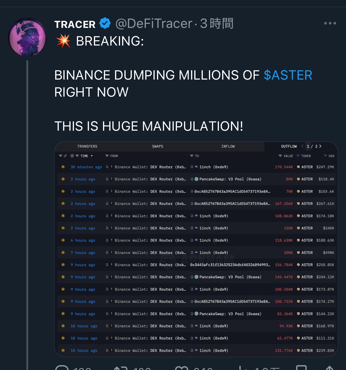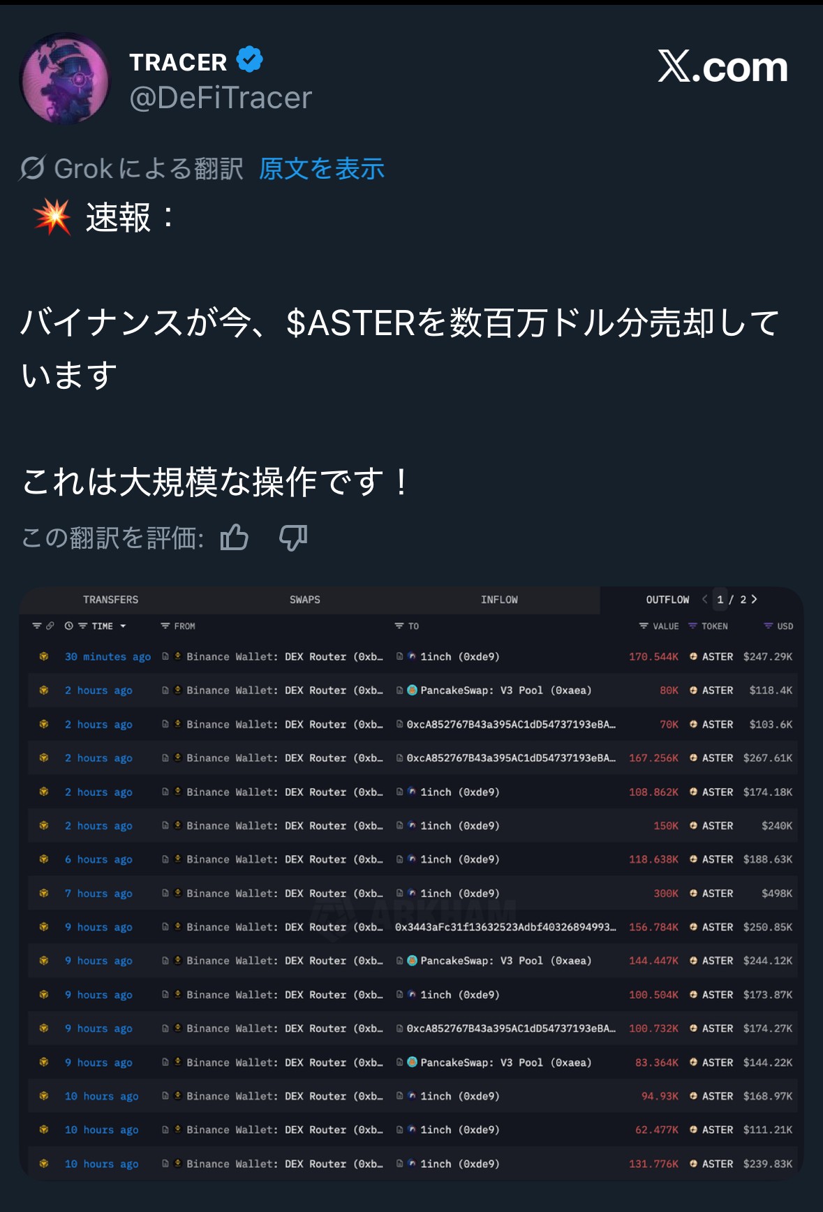 今話題のBinanceに上場したAsterをBinanceが大量売却してダンプし、これは重大な問題だというような内容でした。