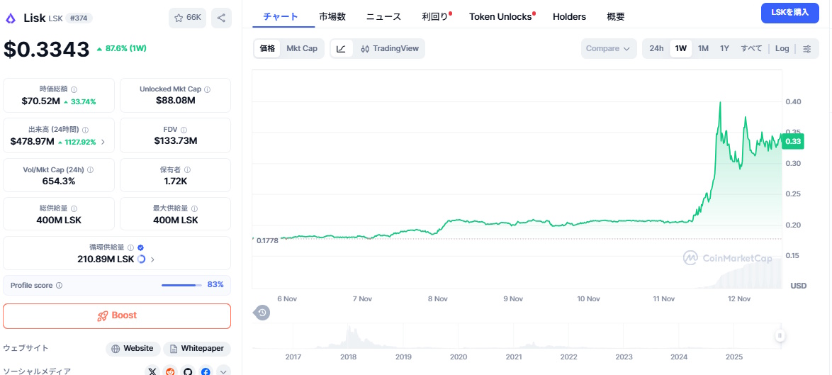 直近だと、数年前まではCMCトップ20以内に入っていたLisk。