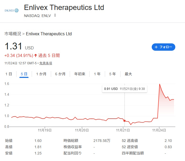 トークンの価格もそうですが、Enlivex社自体の株価も急騰しています。