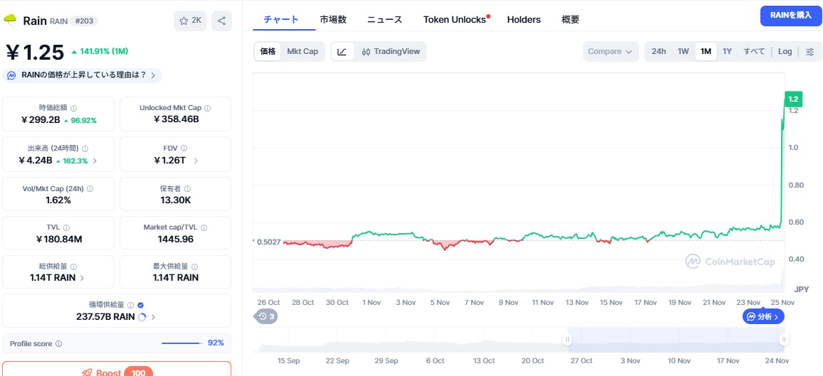 1日で100%上昇、CMC500位から200位まで一気に上がってきました。