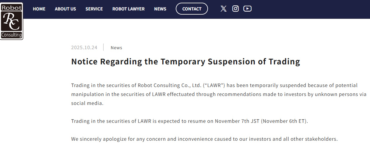(ロボットコンサルティング株式会社(以下「LAWR」)の株式は、ソーシャルメディアを通じた身元不明の投資家への推奨行為による株価操作の可能性があるため、ナスダックでの株式売買停止となっております。)